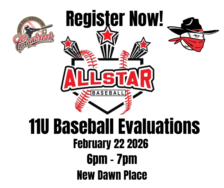 11U Bandit All Star evals Feb 22, 2026 @ New Dawn Place 6-7pm. $30. Bring gear. Register at cranbrookminorball.net ?