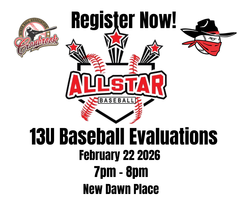 13U Bandit All Star evals Feb 22, 2026 @ New Dawn Place 7-8pm. $30. Bring gear. Register at cranbrookminorball.net ?