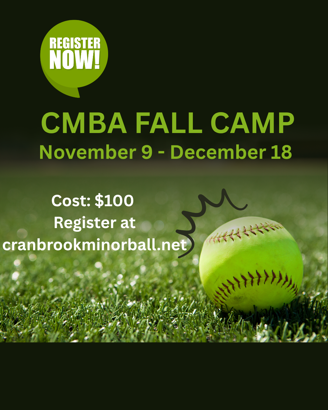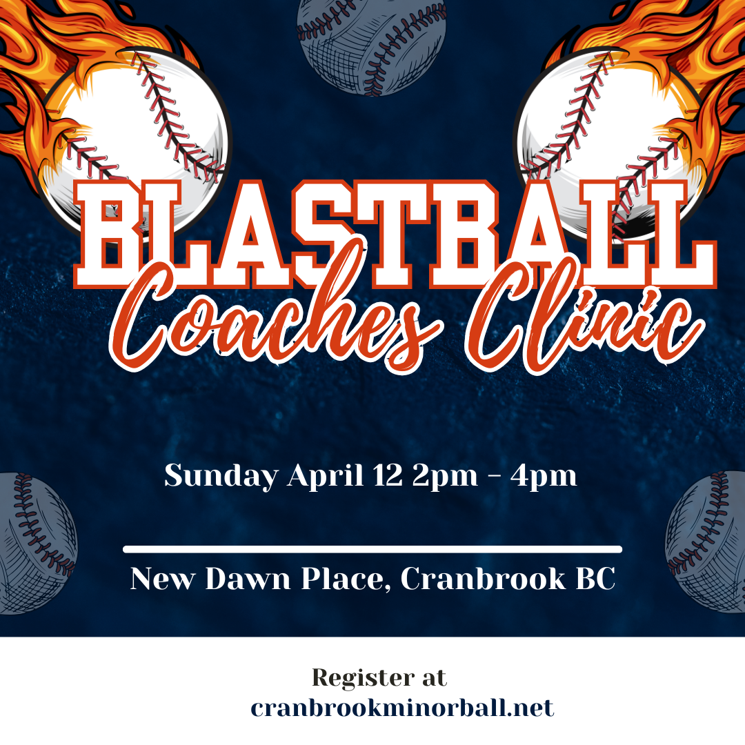 Coaches Clinic April 11 10am - 5pm and April 12 9am - 2pm New Dawn Place. Register at cranbrookminorball.net